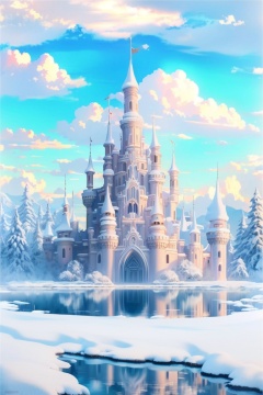 ((HRD, HUD, 8K)),((masterpiece, best quality)), highly detailed, soft light,Castle, no humans, scenery, sky, cloud, day, castle, outdoors, blue sky, mountain, water, snow, reflection, cloudy sky, tower, <lora:20240404-1712222230686:0.9>