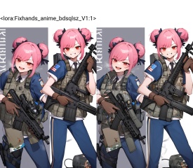 1girl, mori calliope \(streetwear\), hololive,  score_9, score_8_up, score_7_up, 4k, uncensored, prefect lighting, rating_explicit, anime, bullet, magazine ejection, microphone, red eyes, holding gun, double bun, smoke, smug, character name, copyright name, plate carrier, brown gloves, gun, alternate hairstyle, drum magazine, alternate costume, military, comic, magazine \(weapon\), p90, m249, military vehicle, english text, short sleeves, ponytail, trigger discipline, blue jacket, holding microphone, multiple views, jacket, bullpup, weapon, scope, submachine gun, assault rifle, smile, pink hair, pants, gloves, holding weapon, rifle, virtual youtuber, blue pants, grin, open mouth, hair bun, best quality, masterpiece, very aesthetic,  sensitive <lora:Fixhands_anime_bdsqlsz_V1:1>