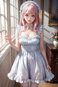 (masterpiece, best quality), 1girl, blue and white frill dress, (white stockings), pink hair, cute face, standing, indoor, intricate detail, sunlight, <lora:add_detail:1>