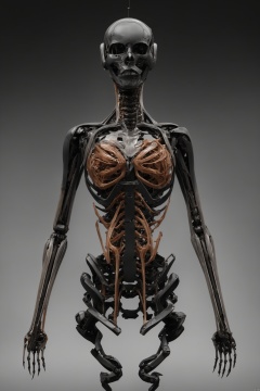White robot ,Front view of the robot,White background, english text, no humans, watermark, robot, mecha, science fiction, realistic, skeleton, non-humanoid robot, spine,Ribs, ulna, sternum, scapula, clavicle, mandible,Bionic muscle. Transparent skin. Transparent muscle.