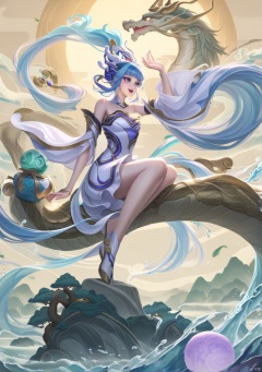 Game style,WANGZHE,1girl,long hair,sitting,water,blue hair,dress,solo,open mouth,purple eyes,detached sleeves,bare shoulders,hair ornament,dragon,floating hair,strapless dress,very long hair,white dress,bangs,hand up,wide sleeves,blue eyes,panorama,