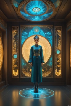 At the core of the composition, a figure stands before an ornate digital mirror, its frame embellished with complex, futuristic engravings. Unlike a traditional mirror, its surface flickers beneath the solitary glow of neon lights, revealing a contorted, other-dimensional vista. Within this projection, there stands a woman clad in a reimagined cyber-Han dynasty dress, her back turned to the viewer, occupying a lavishly decorated interior space infused with a blend of Eastern aesthetics and cutting-edge technology. Notably featured is a grand, gilded smart-mirror embedded within a sleek, cybernetic tabletop, intricately etched with exquisite digital motifs and totems.
