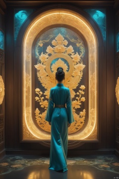 In a cyberpunk-fused, darkly spellbinding fairy tale setting, we envision an art piece entitled 'Mirror Walker', which masterfully blends the essence of surrealistic painting with dreamlike aesthetics. This work is drenched in luminous neon tones, diving deep into the undercurrents of Chinese folklore while interweaving an ineffable sense of cyber-horror.At the core of the composition, a figure stands before an ornate digital mirror, its frame embellished with complex, futuristic engravings. Unlike a traditional mirror, its surface flickers beneath the solitary glow of neon lights, revealing a contorted, other-dimensional vista. Within this projection, there stands a woman clad in a reimagined cyber-Han dynasty dress, her back turned to the viewer, occupying a lavishly decorated interior space infused with a blend of Eastern aesthetics and cutting-edge technology. Notably featured is a grand, gilded smart-mirror embedded within a sleek, cybernetic tabletop, intricately etched with exquisite digital motifs and totems.Filtered sunlight simulates through holographic lattice windows, casting stark shadows that define each object with precision, imbuing the scene with a sense of eerie stillness and timelessness. Despite facing away, her eyes connect directly with the observer via the reflective interface, drawing viewers into an indescribable, timeless terror. This gaze encapsulates memories that span eons, suspended at the precipice between life and digital afterlife, sending chills down the spine while simultaneously captivating with an irresistible cybernetic allure—a profound conversation across the dimensions of time and cyberspace, exploring the blurred boundaries between reality, virtuality, existence, and obsolescence.<lora:EMS-329777-EMS:0.100000>, <lora:EMS-337923-EMS:0.800000>, <lora:EMS-322155-EMS:0.300000>