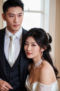 1man and 1woman,cuddling,Asian,exquisite facial features,charming,affectionate,(muscular handsome man wearing formal suit,)BREAK(pretty woman wearing wedding_dress,off shoulders,neck lace),Volumetric lighting,full shot,High-end fashion photoshoot,(masterpiece, realistic, best quality, highly detailed),jzns,plns,pjcouple