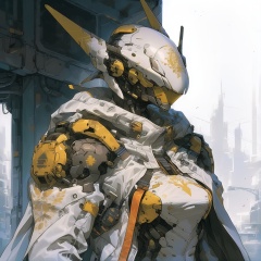 cyborg, no humans, upper body, jacket, helmet, cape, long sleeves, white jacket, shirt, headgear,
