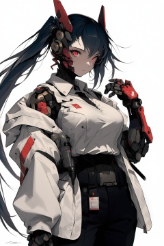 masterpiece, best quality, aesthetic,cyborg, 1girl, solo, red eyes, black hair, long hair, jacket, pants, breasts, white background, looking at viewer, shirt, cowboy shot, robot joints, open clothes, headgear, belt, glowing, medium breasts, open jacket, simple background, single mechanical arm, standing, long sleeves, white jacket, signature, realistic, twintails