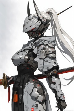 masterpiece, best quality, aesthetic,cyborg, weapon, sword, katana, solo, holding, sheath, ponytail, holding weapon, holding sword, helmet, white background, horns, 1girl, simple background, white hair, red eyes, glowing, no humans, upper body, robot joints, from side
