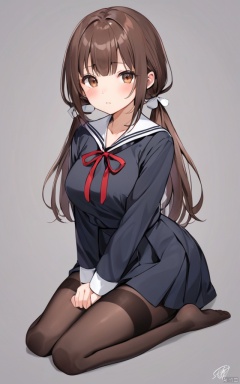 1girl, solo, brown hair, pantyhose, shuuchiin academy school uniform, school uniform, red ribbon, ribbon, brown eyes, twintails, no shoes, looking at viewer, long sleeves, bangs, sitting, dress, neck ribbon, blush, low twintails, wariza, long hair, between legs, closed mouth, black pantyhose, black dress, hand between legs, breasts, armband, full body, simple background, grey background, signature, thighband pantyhose, collared dress, collarbone, white background, arm support