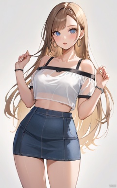 1girl, solo, long hair, jewelry, skirt, earrings, blue eyes, looking at viewer, white background, shirt, breasts, simple background, cowboy shot, parted lips, white shirt, collarbone, crop top, hoop earrings, multicolored hair, off-shoulder shirt, black skirt, off shoulder, gradient hair, hands up, bracelet, bare shoulders, very long hair, high-waist skirt, bra strap, short sleeves, underwear, bra, miniskirt, black bra, parted bangs, bangs, pencil skirt, denim, medium breasts, midriff, thighs, brown hair, bra visible through clothes, blonde hair, standing, see-through, denim skirt