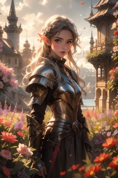 (masterpiece:1,2),best quality,elf knight01,1girl,upper_body,medieval architecture,flower sea,(front view:1.3),