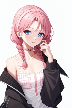 <lora:蓝毒-000008:1>,a girl named arklandu,arklandu,1girl,long sleeves,open jacket,twin braids,official alternate costume,off shoulder,pink choker,spaghetti strap,, (masterpiece,best quality,high quality:1.4),absurdres,