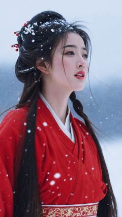 cinematic photo,Best quality,(masterpiece:1.2),cinematic photo,1girl,A beautiful girl in red hanfu,Standing in the wind andsnow,long hair blown by the wind,snow in the sky,upperbody,snowing,snowy day,in winter,close-up,(close mouth:1.1),front view,35mm photograph,film,professional,4k,highly detailed,