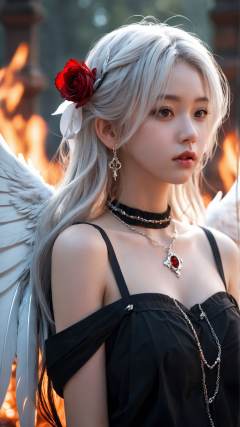 Best quality,masterpiece,ultra high res,(photorealistic:1.4),Arknights,masterpiece,[dusty color],soft light,[blurry texture],1girl,solo,(an extremely delicate and beautiful girl),large_breasts,looking at sky,(white_hair),very_long_hair,wavy hair,expressionless,expressionless eyes,red_eyes,longeyelashes,beautiful detailed eyes,((blood)),closed mouth,hair_flower,earrings,flower ribbon,pointy ears,gothic_lolita,off_shoulder,black_dress,sleeveless_dress,cross necklace,((dorsal wings on girl's back)),((angel wings on girl's back)),navel,night,full_moon,cloudy,spruce,(burning_forests),(fire),fire shine on the face,flame,fighting_stance,(windy),(white_feathers),falling_rose petals,(in_ruins),blurry background,fantastic streamer,brilliant galaxy,walking,boots,((swords)),1girl,solo,looking at viewer,Best quality,masterpiece,ultra high res,(photorealistic:1.4),