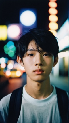 (((1boy))),Asian male,17(yo),Fujifilm Provia 400X,heavy breathing,night view,polaroid photo,night photo,pale skin,bokeh,motion blur,
