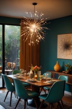 interior design,Mid-Century Modern Dining Room with Eames Chairs and Atomic Decor,Sparklers held by the subject for a dynamic and energetic effect (Sparklers),4k,HD,HDR,