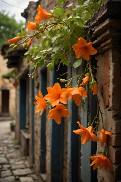 cinematic photo Trumpet vine climbs along the old wall with its vibrant orange blossoms, bringing vitality and color to the rustic setting., (sharp focus:1.2), extremely detailed, (photorealistic:1.4), (RAW image, 8k high resolution:1.2), RAW candid cinema, 16mm, color graded Portra 400 film, ultra realistic, cinematic film still, subsurface scattering, ray tracing, (volumetric lighting) . 35mm photograph, film, bokeh, professional, 4k, highly detailed