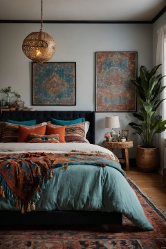 Create a Bohemian-style bedroom design with integrated modern technology. Emphasize vibrant colors, eclectic patterns, and a mix of textures. The room should feel free-spirited and artistic, with unconventional decor and smart home gadgets. Consider including elements like programmable mood lighting and artistic digital displays. This design should foster a sense of creativity and unconventionality, appealing to those who love a lively, tech-savvy, and unconventional living space.