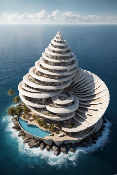 bird eye view, shell shaped, Science fiction architecture complex, Made from shell, Overlooking, sea, (masterpiece, best quality, perfect composition, very aesthetic, absurdres, ultra-detailed, intricate details, Professional, official art, Representative work:1.3), Dream Homes