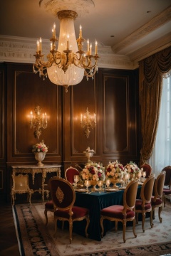 Classical luxury hotel reception, ornate gold accents, velvet drapery, antique chandeliers, grand floral arrangements, rich and elegant atmosphere.
