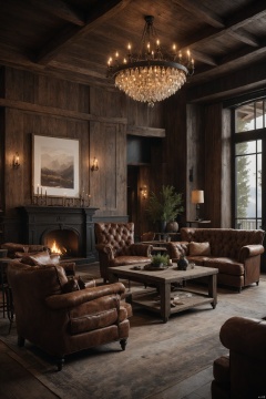 Rustic chic hotel lobby, distressed wood reception desk, farmhouse-style chandeliers, leather couches, cozy fireplace, welcoming and homely atmosphere, ultra detailed, mysterious, perfect environment, cinematic lighting, product photography, unreal engine, 8K
