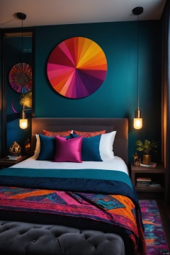 Cute girl, Sexy pose, Fashionable ,Vibrant colors, colorful clothes, Confident expression, Majestic environmental elements, Striking and modern cover design, Trendy and attention-grabbing background, Center of focus is fashion.in the dark,deep shadow,Bohemian-style bedroom design with integrated modern technology. Emphasize vibrant colors, eclectic patterns, and a mix of textures. The room should feel free-spirited and artistic, with unconventional decor and smart home gadgets. Consider including elements like programmable mood lighting and artistic digital displays. This design should foster a sense of creativity and unconventionality, appealing to those who love a lively, tech-savvy, and unconventional living space.