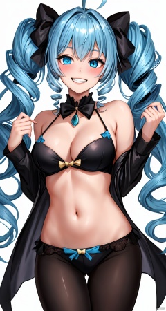 1girl, solo, long hair, breasts, looking at viewer, blush, smile, bangs, blue eyes, large breasts, simple background, white background, bow, navel, bare shoulders, twintails, jewelry, medium breasts, blue hair, collarbone, ahoge, hair bow, cowboy shot, teeth, alternate costume, shiny, stomach, grin, shiny hair, black bow, heterochromia, drill hair, gem, revealing clothes, twin drills