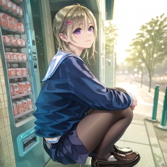 (masterpiece),(best quality),illustration,ultra detailed,hdr,Depth of field,(colorful),1girl,solo,purple eyes,black footwear,white sailor collar,outdoors,loafers,shoes,hairclip,sailor collar,shirt,blue serafuku,closed mouth,hair between eyes,black pantyhose,vending machine,blue skirt,black skirt,