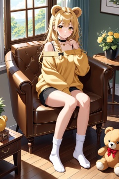 1girl, solo, long hair, looking at viewer, blush, bangs, blonde hair, long sleeves, bow, animal ears, bare shoulders, brown eyes, sitting, collarbone, full body, yellow eyes, braid, ahoge, parted lips, shorts, choker, day, socks, puffy sleeves, indoors, off shoulder, :o, sweater, sleeves past wrists, short shorts, window, single braid, bell, black choker, chair, no shoes, black shorts, stuffed toy, stuffed animal, white socks, couch, teddy bear, wooden floor, on couch, brown sweater, on chair, off-shoulder sweater, armchair, yellow sweater