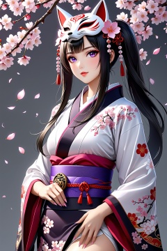 8k, best quality, masterpiece, (ultra-detailed:1.1), (high detailed skin),(full body:1.3), standing, looking at viewer, (solo:1.4), hand on hip, huahuo, 1girl, single_glove, mask on head, sash, black hair, twintails, purple eyes, obi, fox mask, single glove, japanese clothes, Cherry blossom tattoo, chest tattoo,(beautiful_face), ((intricate_detail)), clear face,((finely_detailed)), fine_fabric_emphasis,((glossy)), full_shot,