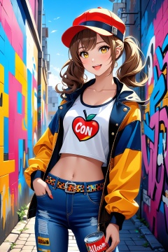 best quality,high resolution,distinct image,best quality,high resolution,distinct image,Original Characters,Natural Volumetric Lighting And Best Shadows,Deep Depth Of Field,Sharp Focus,Portrait Of Stunningly Beautiful Petite Girl,Soft Delicate Beautiful Attractive Face With Alluring Yellow Eyes,Lovely Small Breasts,Sharp Eyeliner,Seductive Smiling,Open Mouth With Cute Fangs Out,Windswept Disheveled Brown Hair,Thick Layered Medium Twintail Hairstyles,Blush Eyeshadow With Thick Eyelashes,Parted Lips,Applejack Hat,Oversized Pop-Art Jacket,Slim Waist With Open Cute Navel,Denim Jeans Pants With Buckle Belt,(Messy Painted Body:1.05),(Holding Spray Paint Can:1.1),(Graffiti Murals Wall Background:1.15),(Standing On Narrow City Streets Crossword:1.2),(Highest Quality, Amazing Details:1.4),Masterpiece,Bloom,Picturesque,Brilliant Colorful Paintings,masterpiece,Hd,