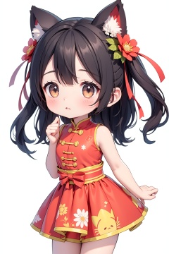 1girl,profile,solo,long hair,breasts,looking at viewer,blush,bangs,simple background,white background,animal ears,bare shoulders,closed underwear,standing,flower,small breasts,sleeveless,alternate costume,cat ears,animal ear fluff,bare arms,bell,leaning forward,sleeveless dress,shadow,chinese clothes,red dress,(china dress),jingle bell,Hands up,happy new year,