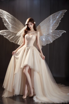 Bare shoulders,dress,Fairy wings,Body,high heels,jewelry,ring,solo,stand,Strapless dress,veil,wedding dress,White dress,wing,<lora:so_v1.0:0.7>,