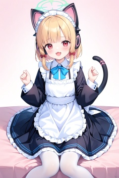 bangs, blonde hair, red eyes, long sleeves, dress, bow, animal ears, tail, pantyhose, frills, shoes, alternate costume, cat ears, apron, black dress, cat tail, maid, maid headdress,fake animal ears, headphones, halo, blue bow, frilled dress, white apron, maid apron, white pantyhose, frilled apron, animal ear headphones, cat ear headphones, momoi \(blue archive\), momoiMaid, momoiBA