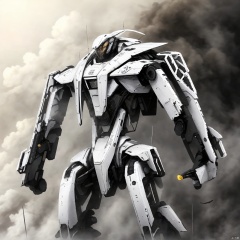 holding, weapon, signature, gun, no humans, robot, mecha, science fiction, realistic, fog, radio antenna