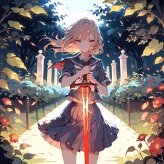 glowing sword, 1girl, solo, serafuku, school uniform,  garden, holding sword, red glowing sword