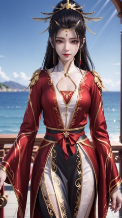 1girl, red dress, solo, hair ornament, black hair, chinese clothes, earrings, dress, jewelry, long sleeves, long hair, mischevious smile, perfect body, scenery, sharp focus, best quality, masterpiece, detailed outfit, illustration, perfect eyes, finely detailed beautiful anime eyes, realistic skin, intricate details, best lighting, depth of field, ultra high resolution,cowboy_shot, dynamic pose, dynamic angle,