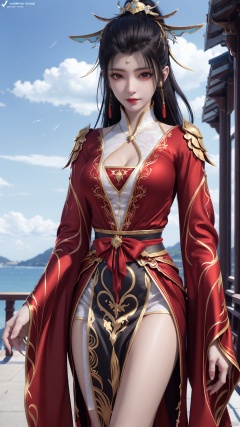 1girl, red dress, solo, hair ornament, black hair, chinese clothes, earrings, dress, jewelry, long sleeves, long hair, mischevious smile, perfect body, scenery, sharp focus, best quality, masterpiece, detailed outfit, illustration, perfect eyes, finely detailed beautiful anime eyes, realistic skin, intricate details, best lighting, depth of field, ultra high resolution,cowboy_shot, dynamic pose, dynamic angle,