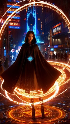1girl,<lora:xl-shanbailing-0116magic array:0.8>,magic circle,magic array,magic circles,magic array,1girl,mecha,black,cloak,dark style,ultra wide,octane render masterpiece,beautiful depth of field,ultra wide field,ultra detailed CG perspective,ultra dynamic lighting amazing shadows,cityscape,hell,blue fluorescence,