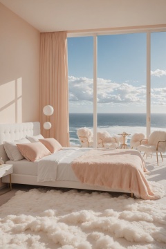 a bedroom with fluffy white furniture and a large window overlooking the ocean and clouds in the sky