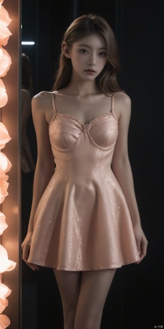 1girl,solo,in the dark, HUBG_Beauty_Girl, dress,deep shadow,reflection light,depth of field,black background,simple background,( chiaroscuro,Fujicolor, UHD, super detail ,raw,85mm,f/1.2,FujifilmXT4,),