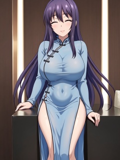 1girl,solo,perfect face,look at viewer,sitting,teacher,bangs,eyebrows visible through hair,purple hair,very long hair,shiny hair,blue eyes,closed eyes,blush,lips,parted lips,smile,blue dress,long sleeves,china dress,chinese clothes,covered bra,large breasts,see-through,see-through silhouette,side slit,white,masterpiece,best quality,highly detailed,
