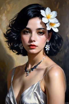 1girl,solo,black hair,short hair,jewelry,realistic,earrings,hair ornament,black eyes,lips,collarbone,parted lips,flower,watermark,upper body,portrait,hair flower,dress,web address,looking awayirt,Oil painting light and shadow,realistic oil painting,oil painting strokes
