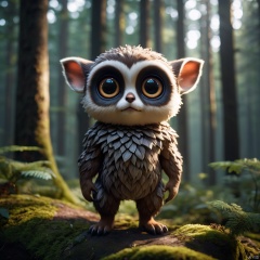 Medium shot, Adorable creature with big reflective eyes, moody lighting, best quality, full body portrait, real picture, intricate details, depth of field, in a forest, fujifilm xt3, outdoors, bright day, beautiful lighting, raw photo, 8k uhd, film grain, unreal engine 5, ray tracing