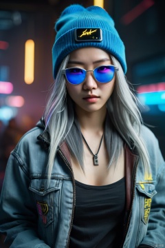 photorealistic of a cute Chinese female \(cyberpunk hacker with blue colored glasses,in a jacket with a Beanie long grey hair half teeshirt ripped jeanscy\), lively in a transitional setting, engaging expression,captured in a way that showcases its magnetic,mythical nature in a heartbeat, looking at the camera, ultimate details, captured on a Leica M50, f/1.9. cyberpunk 2077 poster art, perfect environment, cinematic lighting