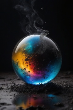 glassy orb, smashes the wet ground, reflection on ground (dark smoky background with brilliant colors:1.4), sheen,, , ral-drptpl
