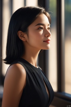 One Girl, Solo, Black Hair,from side Smile, Blurred Background, Depth of Field, Realistic, Soft, Warm, Formal, Masterpiece, Excellent 8K,realistic details, surrealistic, sense of reality, intense contrast of light and shadow