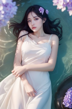 RAW photo,(high detailed skin:1.2),8k uhd,dslr,soft lighting,high quality,film grain,Fujifilm XT3,Best quality,realistic,best quality,masterpiece,high resolution,original,extremely detailed wallpaper,perfect lighting,(very detailed CG:1.6),(((1girl))),(long white dress),((lying)),(look up:1.1),((cowboy shot, )),solo,(((partially_submerged))),water,((purple_flower in the water)),petals_in_liquid,black_hair,wet,(blurry:1.4),flower,hydrangea,cherry_blossoms,pink_flower,wisteria,(top view:1.4),soft light,
