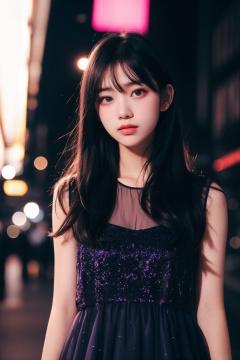 1 girl, upper body, 18 years old, black hair, light pollution, pink light, blue light, night, sheer purple dress, modern city street background, deep field of view, defocus, complex and detailed elements, cool light, deep shadows