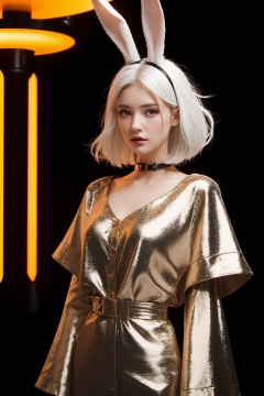 a beautiful female model standing in a space elevator,white hair,rabbit ears,Orange lighting,in the style of realistic hyper-detailed rendering,pseudo-realistic,redscale film,mark henson,nikita veprikov,