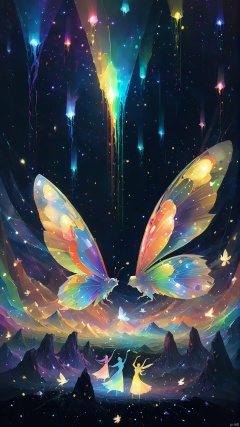 In this strange world, you encounter a group of flying creatures that sparkle with rainbow light, they are made of notes and musical beats, and their flying makes beautiful music. These creatures take you into a vast musical cave where notes dance through the air, creating a feast of light and sound